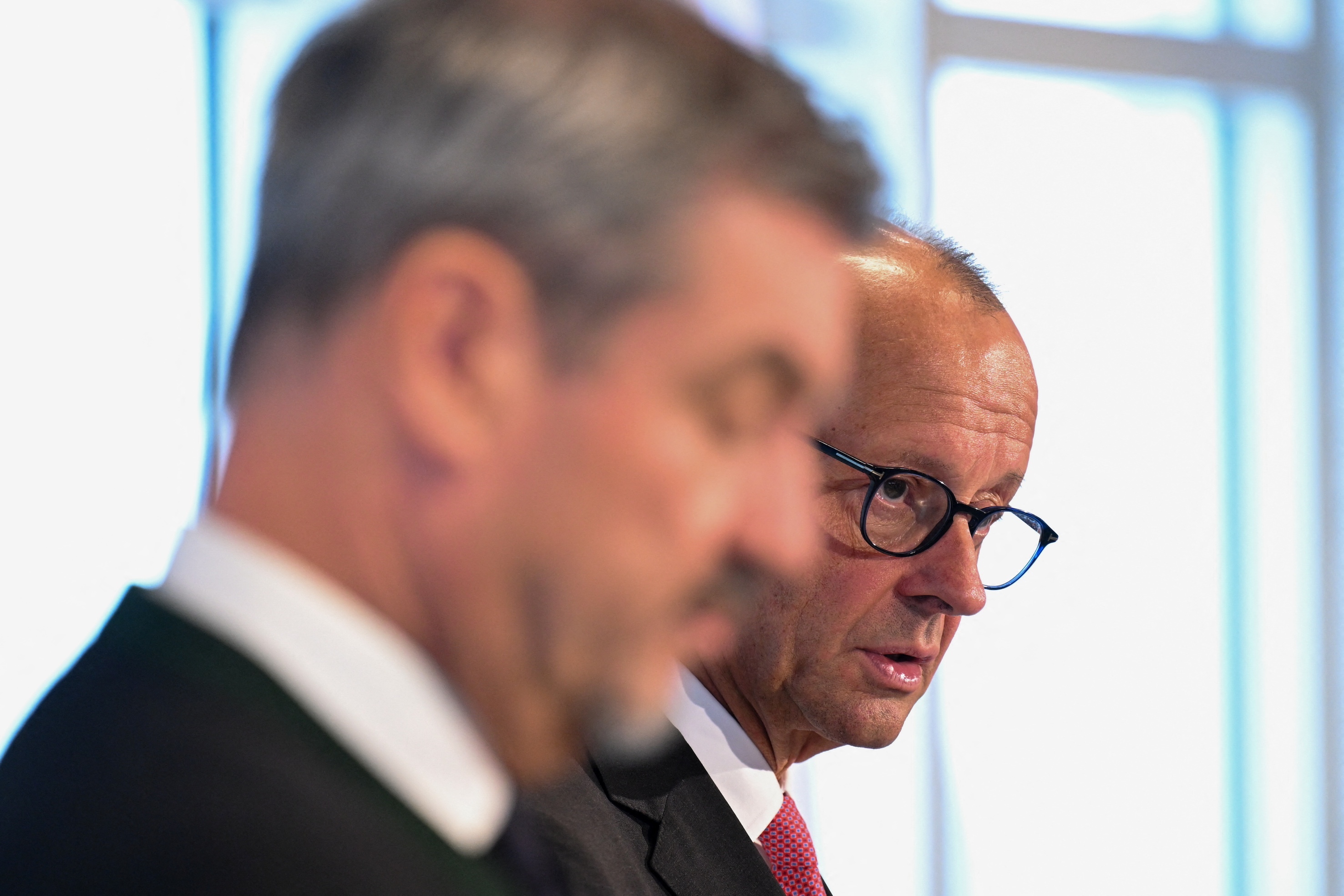 德国总理默茨(右)当天在德国南部巴伐利亚州与州长索德尔举行的一场联合新闻发布会上表示,欧盟已做好对美反制准备,但仍希望通过谈判解决问题。新华社发